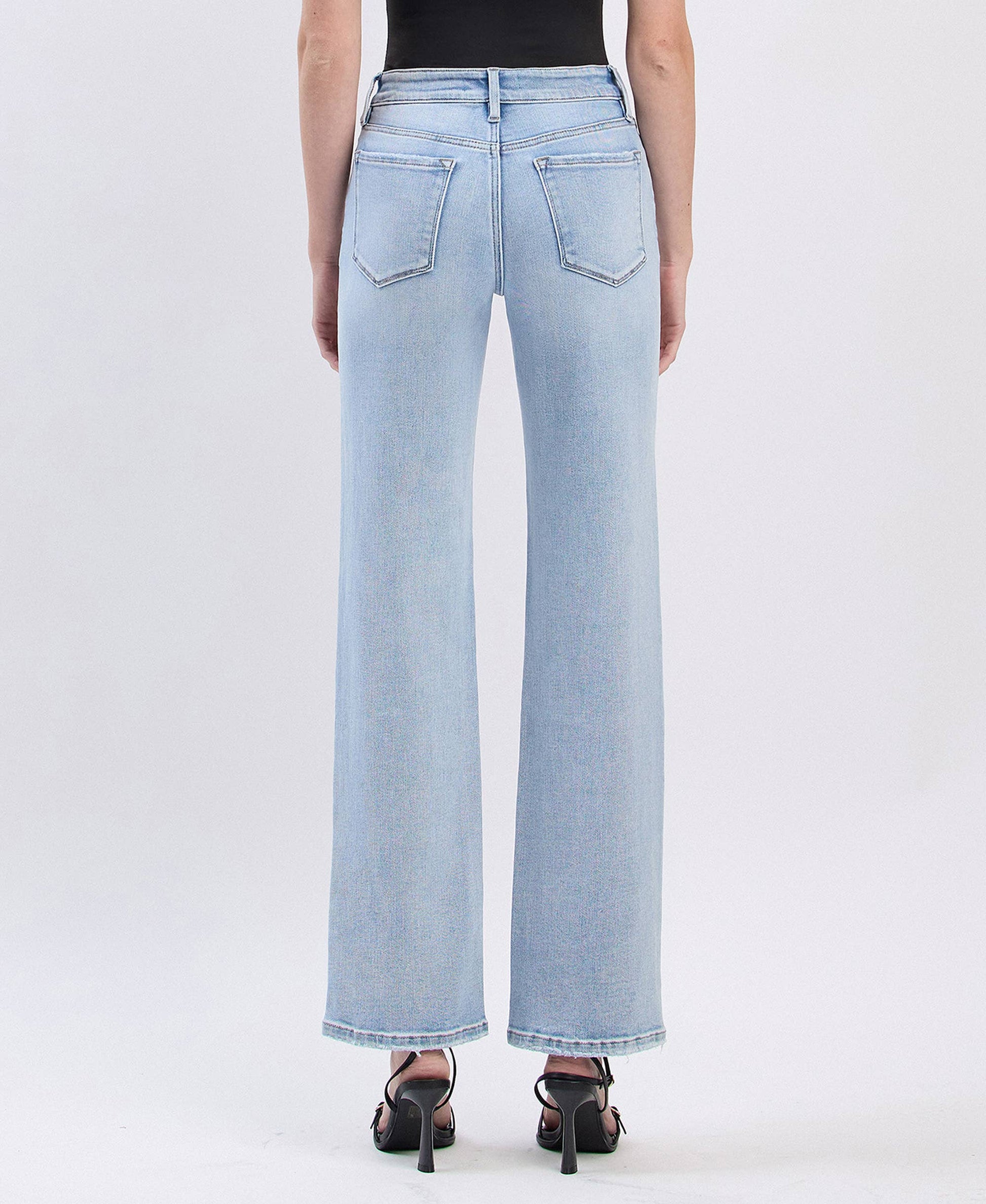 HIGH RISE SLIM WIDE LEG JEANS COMFORT STRETCH DENIM, HIGH RISE WAIST, FINISHED HEM, FULL LENGTH, SLIM WIDE LEG JEANS